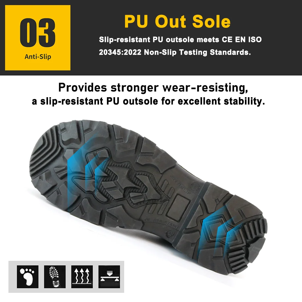 4.防滑PU 外底满足 CE EN ISO 20345:2022 防滑测试标准。