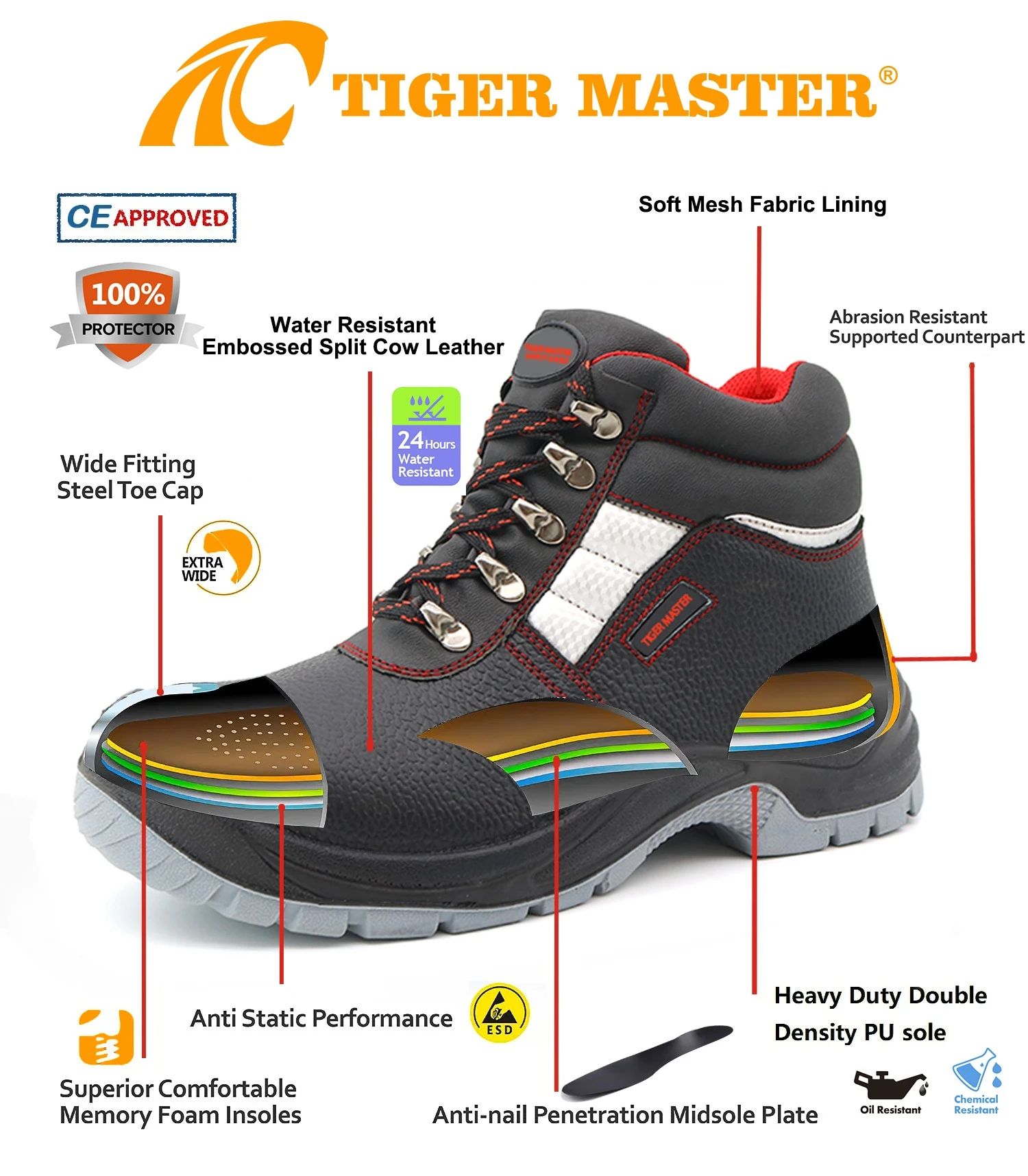 Tiger Master est Chaussures de sécurité et fabricant de bottes de pluie en PVC. Nous avons été qualifiés du système de gestion de la qualité ISO 9001: 2015. De plus, certains de nos modèles de vente à chaud ont qualifié ce de l'iso 20345: 2022 A1: 2024 et ASTM F2413-18. En attendant, nous sommes également une marque professionnelle pour EPI (équipement de protection individuelle) , surtout dans les champs de Gants de sécurité, vêtements de travail, casques, gilet de sécurité , Muff d'oreille / prise, Safet harnais , Refrein de pluie / costume etc. .