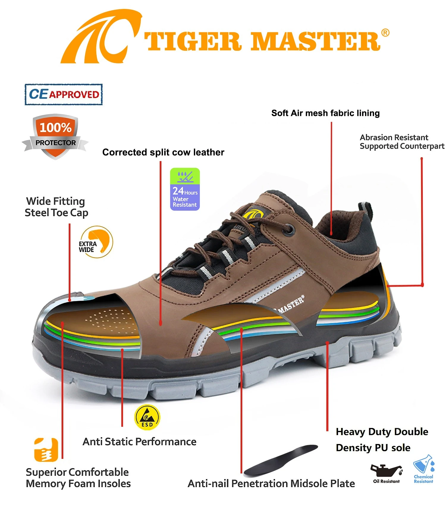1. Get the job done right in the tiger master safety shoes. These lace-up safety shoes are moisture-wicking lining to help keep your feet dry and a slip resistant PU sole for excellent stability.