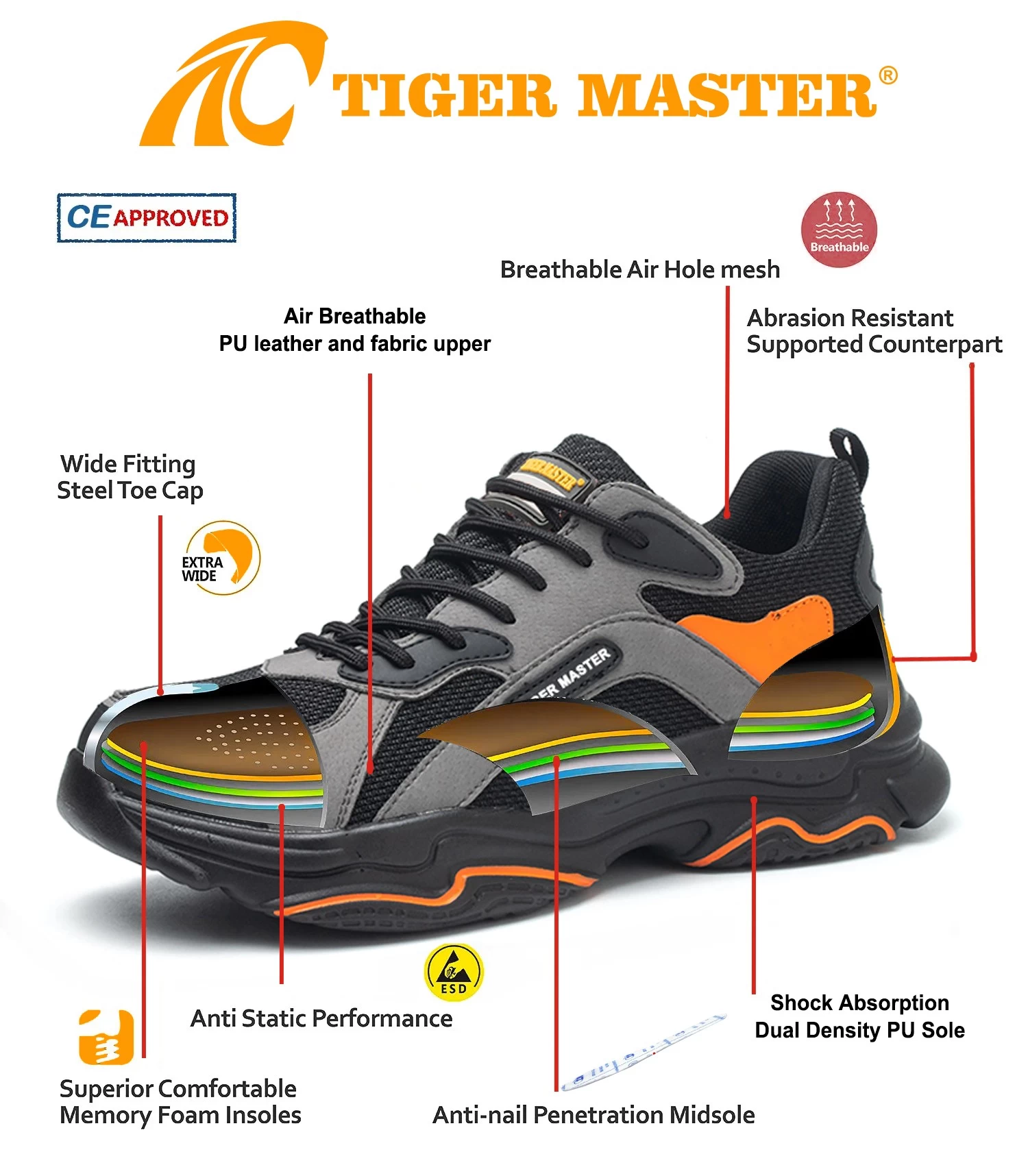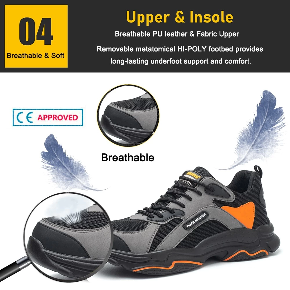 1. Get the job done right in the tiger master safety shoes. These lace-up safety shoes are moisture-wicking lining to help keep your feet dry and a slip resistant PU sole for excellent stability.