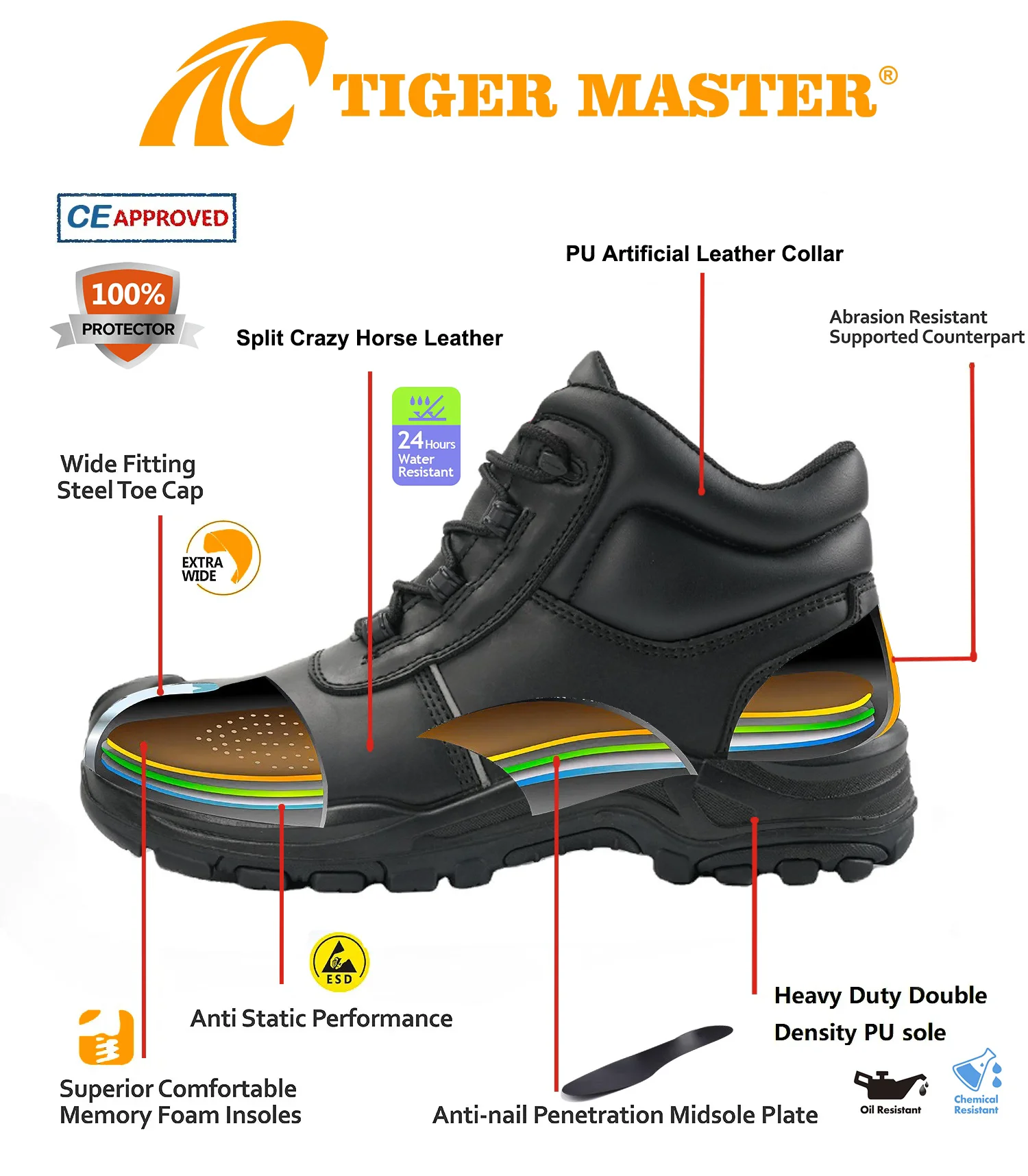 Tiger Master is safety shoes and PVC rain boots manufacturer. We have been qualified ISO 9001:2015 quality management system. Also, some of our hot sale models have qualified CE EN ISO 20345:2022+A1:2024 and ASTM F2413-18. Meanwhile, we are also a professional brand for PPE (Personal protective equipment), especially in the fields of safety gloves, working garments, helmets, safety vest, ear muff/plug, safety harness, rain coat/suit etc.