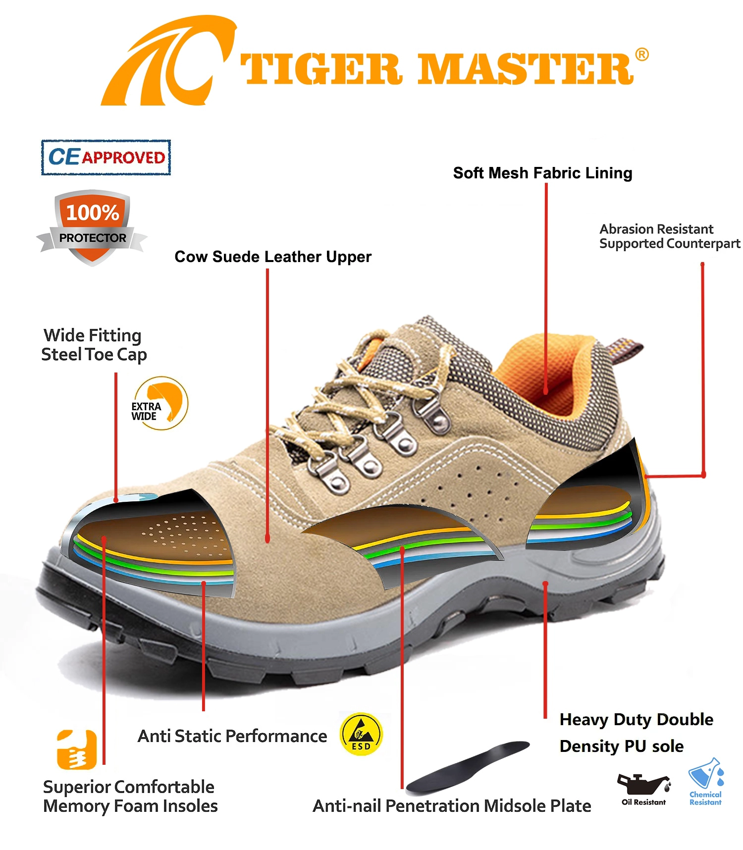 Tiger Master is safety shoes and PVC rain boots manufacturer. We have been qualified ISO 9001:2015 quality management system. Also, some of our hot sale models have qualified CE EN ISO 20345:2022+A1:2024 and ASTM F2413-18. Meanwhile, we are also a professional brand for PPE (Personal protective equipment), especially in the fields of safety gloves, working garments, helmets, safety vest, ear muff/plug, safety harness, rain coat/suit etc.