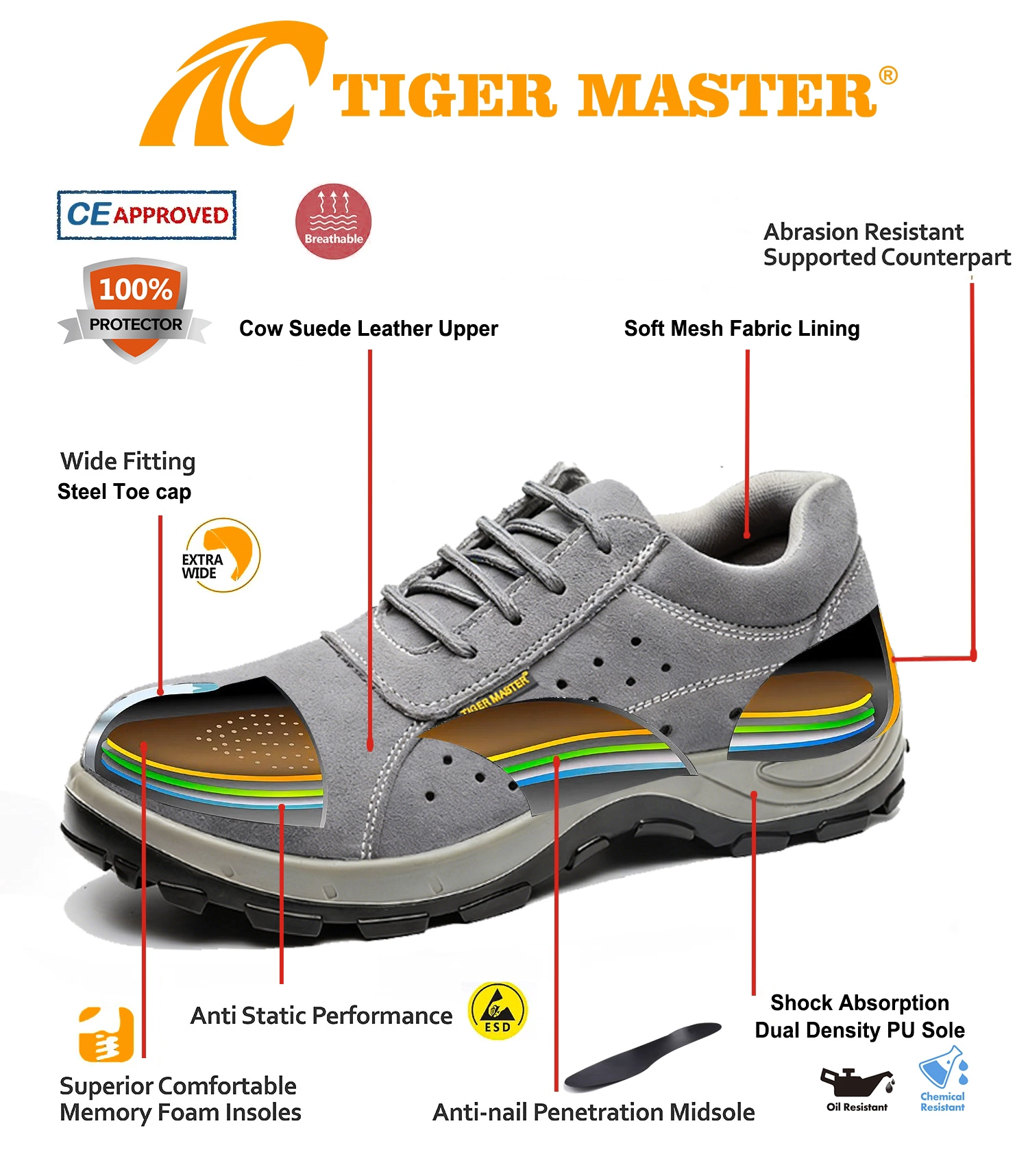 1. Get the job done right in the tiger master safety shoes. These lace-up work shoes are moisture-wicking lining to help keep your feet dry and a slip resistant PU sole for excellent stability.