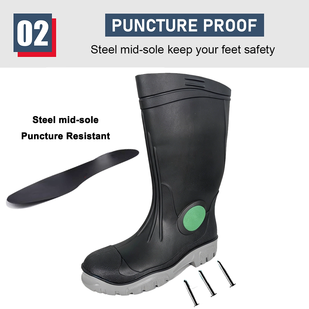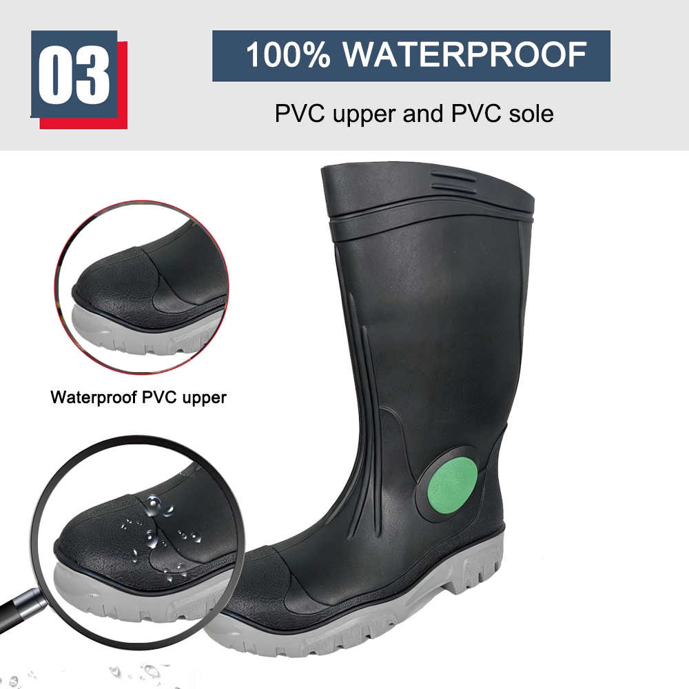 | Название продукта: | Прочные защитные резиновые сапоги из ПВХ черного цвета со стальным носком и стальной средней подошвой. |