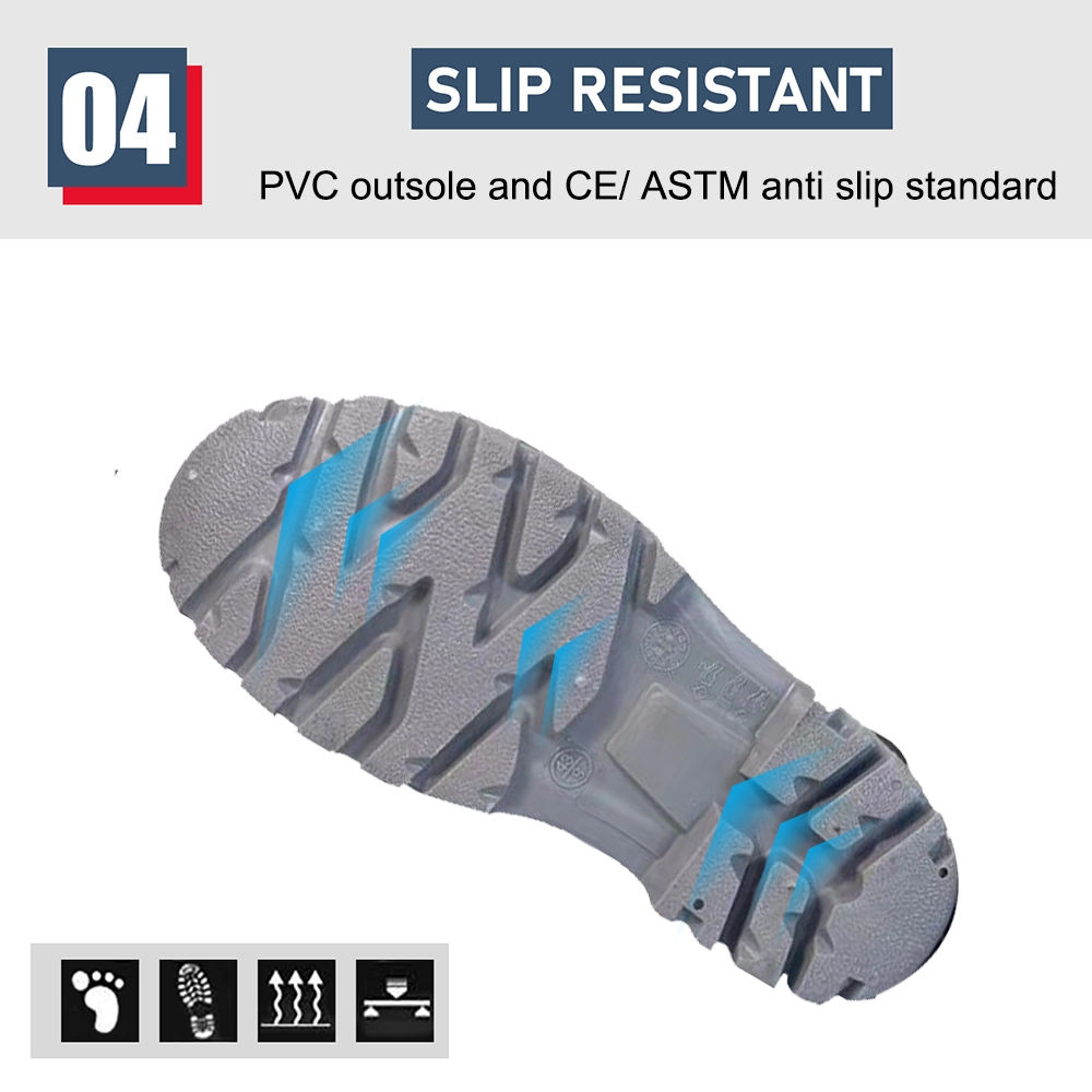 1. Водо/кислотные/щелочи/масло/жиростойкие, нескользящие, антистатические сапоги из ПВХ. 2. Подошва устойчива к истиранию и контракту. 3. Защита лодыжки, поглощение энергии в области пятки, укрепление пальцев и пятки. 4. Стальной носок должен выдерживать ударную нагрузку 200 джоулей. 5. Стальная средняя пластина устойчива к проколам силой 1100 ньютонов. |