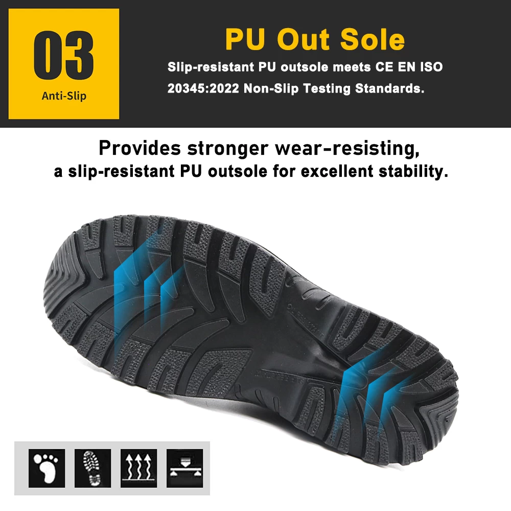 4. Устойчивый к скольжению PU подошва встречается CE en ISO 20345: 2022 Стандарты без скольжения.